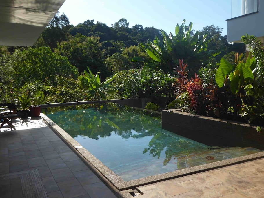 The pool is made from all natural stone and granite. It is designed to give the fresh, cool tropical rock pool/spring appearance. It uses a unique and not often found fresh water system with minimal chemicals. This guarantees that you leave the pool fresher than when you entered and not needing a shower after as salt-water pools always do. |